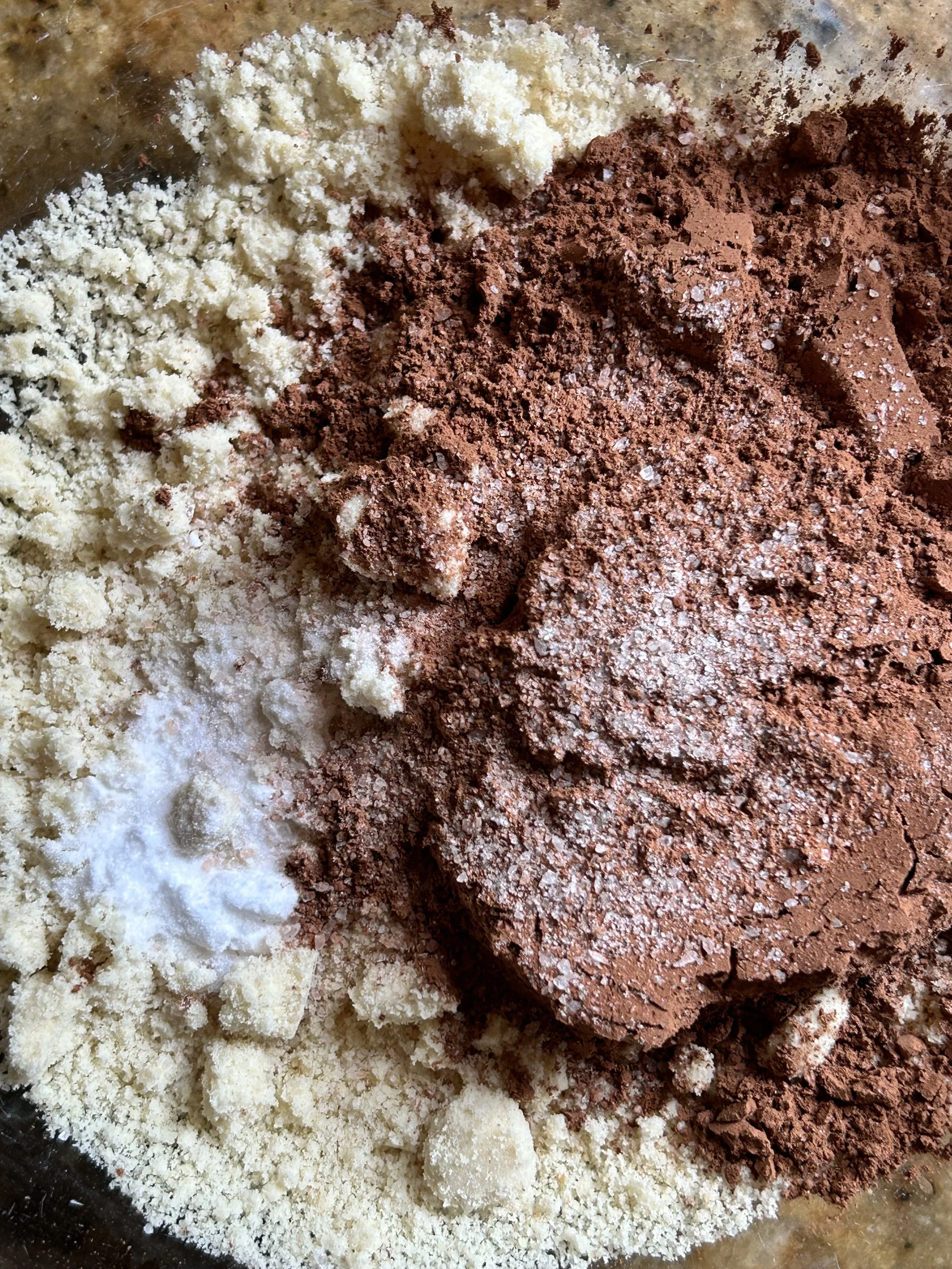 Bowl of almond meal, salt, baking soda and cocoa powder before being mixed.